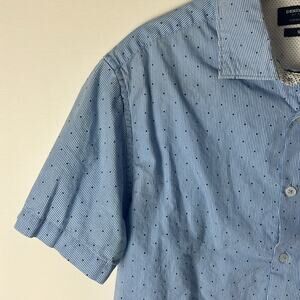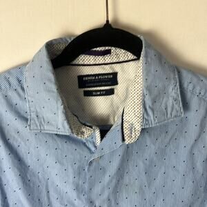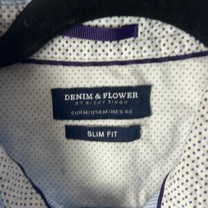 Gently Used Denim & Flower By Ricky Singh Short Sleeve Button Down Shirt. This is a men’s medium. Slim fit. Blue and white thin vertical stripes throughout. Navy blue tiny polka dots. Care tag has been cut, but feels like cotton. Great looking shirt!