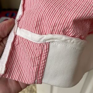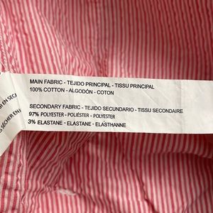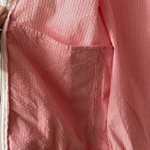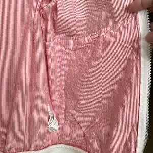 light-weight jacket, perfect for a cool Spring night out; pink and white seersucker with inside and outside pockets