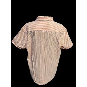 This casual shirt features a lightweight seersucker fabric with orange and white stripes, ideal for warm weather or layering. Its button-up design and short sleeves provide both comfort and style.