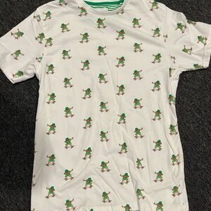 White tee with green stripes and playful print. Casual and fun style.