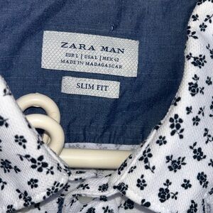 Casual button-down with a white base and blue floral design. Ideal for everyday wear.