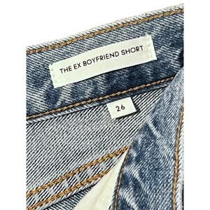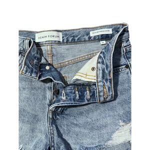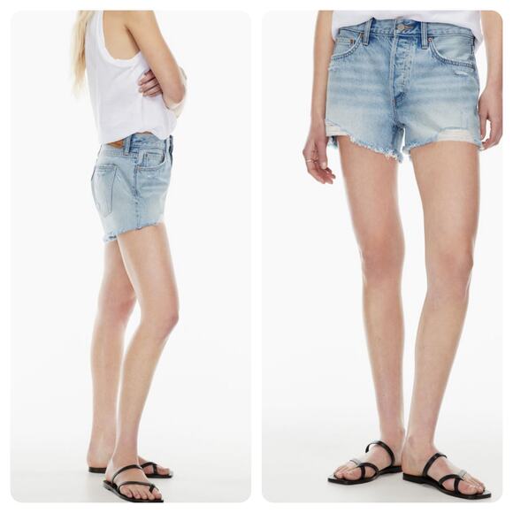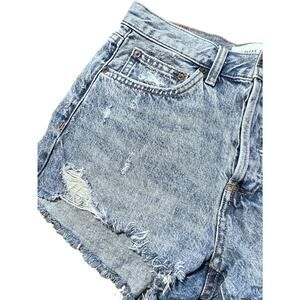 Stylish light blue jean shorts. Frayed hem. Classic five-pocket design. Perfect for casual wear.