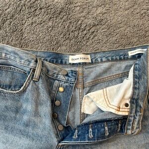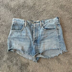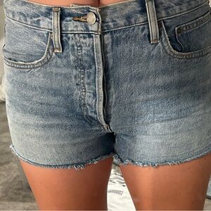 Chic light blue jean shorts. Frayed hem for a trendy look. Perfect for casual wear.