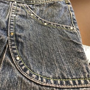 This skirt has pleated front with large patch pockets embellished with rhinestones and the back has word ANGEL embroidered across middle. This Girl's Jean Skirt With Navy knit Shorts Attached also has short 2.5" kick pleats in back and standard belt loops outside.stitching in white and lime Green throughout and metallic stitching around embroidered lettering. Waistline is 10" and length is 11.5".