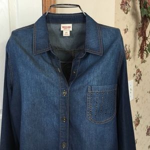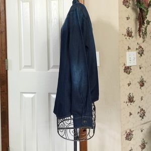 Fun Denim Hi-low button-up shirt with embellished front pocket! Lighter denim on elbows, chest and back of neck/shoulders! Never worn