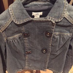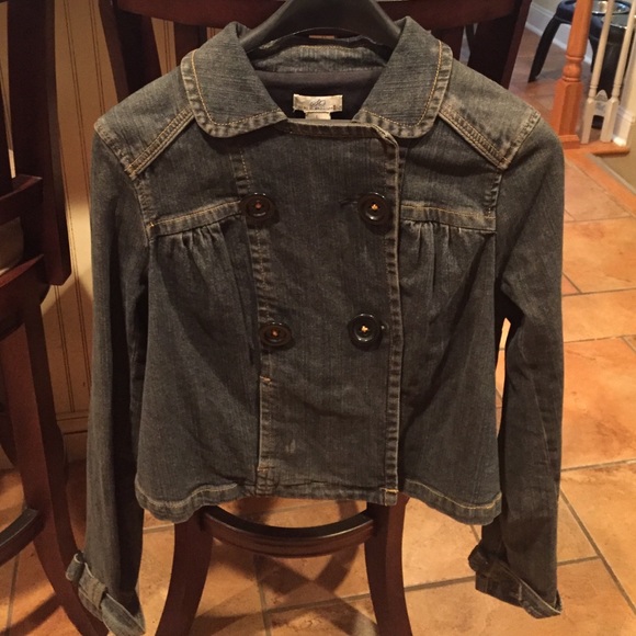Cute double breasted, 4 button denim jacket. Junior label so it runs smaller than a large. Great condition. Worn only a few times. Missing one of the inside buttons.