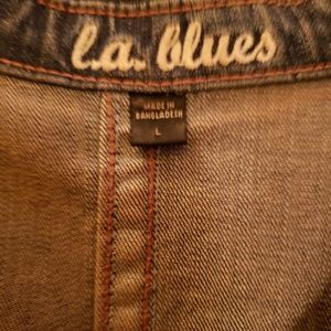 Waist length denim jacket. Cute brass button embellishments. Adjustable back belt. The cut on this jacket is fitted and a Juniors Large.