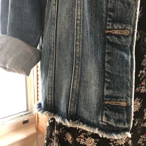Destructed medium wash with raw frayed bottom hem. Size small, true to size with slightly boxy fit.
