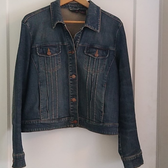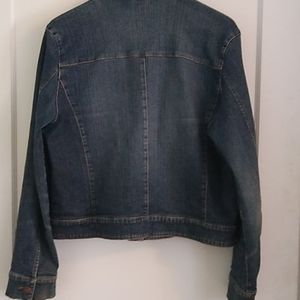 Awesome stretch denim jacket. 21 in armpits armpit and 22 in shoulder to waist. Goes great with jeans or a cool skirt especially when decorated with a cool brooch.
