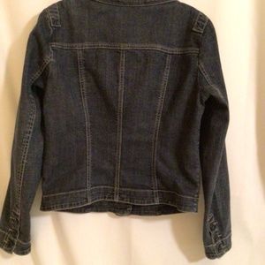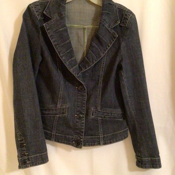 This denim jacket has great detailing on the collar. It is a stretch denim size s. Slightly worn.