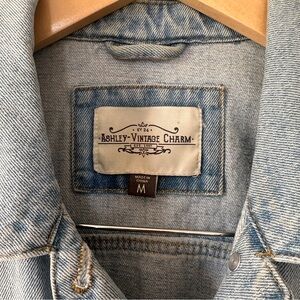 Light wash denim jacket with silver buttons, only worn a couple times. Casual fit, hits at the hips.