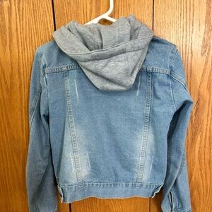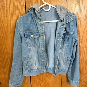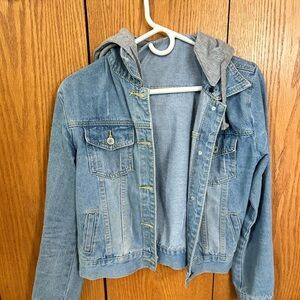 Denim jacket with gray hood attached. It can detach as well. Very comfortable fit. Size small. Great condition, only worn a few times.