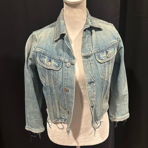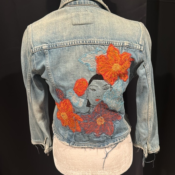 Cute denim jacket. Embroi on the back. Frayed. 3/4 sleeves.