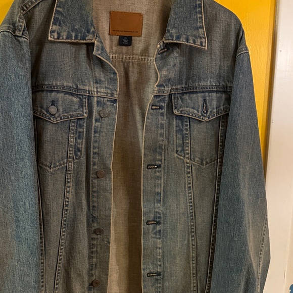 Classic denim jacket with button closure. Features a timeless design.