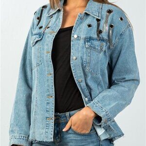 Oversized Denim jacket, Unique with grommets and metal fringe 100% Cotton raw hems button down front pockets If you like winter fall vacation thanksgiving oversized sweaters comfy tops gypsy spell reformation wedding american eagle arnhem holiday Levi's revolve work lulus preppy vici boho new years eve office h&m anthro casual Zara free people dressy cozy christmas anthropology , than shop my Boutique!