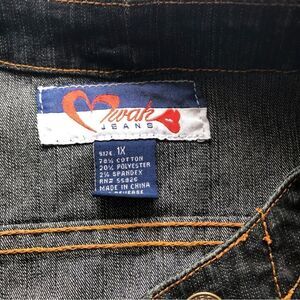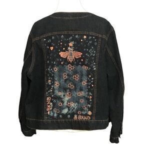 This jacket has the right amount of stretch for a flattering comfort fit. Customized denim back panel with a bee theme, honeycombs, hearts, and stars and a secret message inside of jacket. Be Kind. #BKND