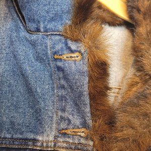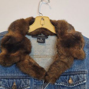 Denim Jacket Faux Fur Collar Womens Size Med Blue Brown Trim Missing Cuff Button