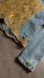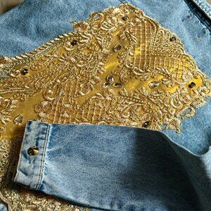 Crafted from premium denim, this statement jacket features gold appliqué on the front and a dramatic embroidered gold back panel, accented with crystal embellishments and beadwork. The scalloped hemline and metallic details add a regal finish, making it a standout piece.
