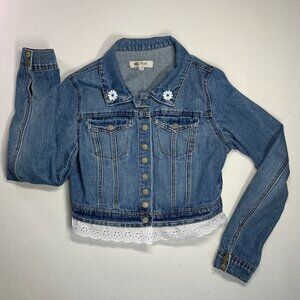This utterly charming jean jacket is a playful, one-of-a-kind piece that's sure to enchant! Featuring adorable ladybug and flower appliques in vibrant red and blue hues. Complete with eyelet trim detailing from Miss Posh. Junior size large.