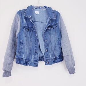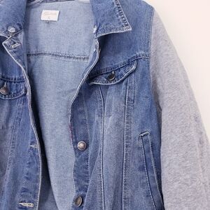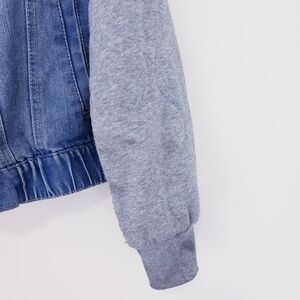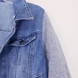 This Denim Jacket with Gray Sweatshirt Sleeves is a Size XL from Miss Posh.