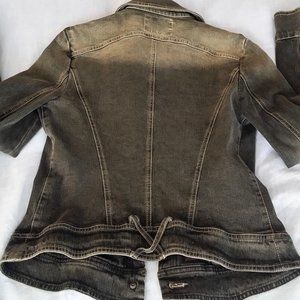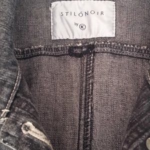 Beautiful fitted jean jacket in black, with a little stretch. Purchased in Florence, Italy. The brand is StiloNoir by K. It has a distressed look. When on, it fits well, with a little stretch. The pockets have a starburst pattern made with tiny crystals. The buttons are silvertoned and very sturdy. I love this jacket! The jacket is 97% cotton, and 3% elastane. Worn only on a few occasions, so it's in Very Good condition!