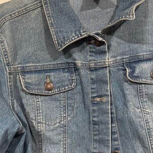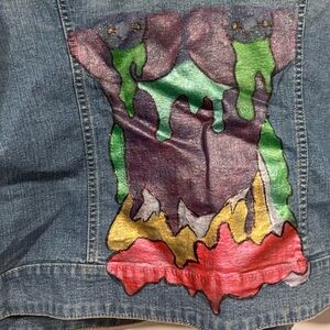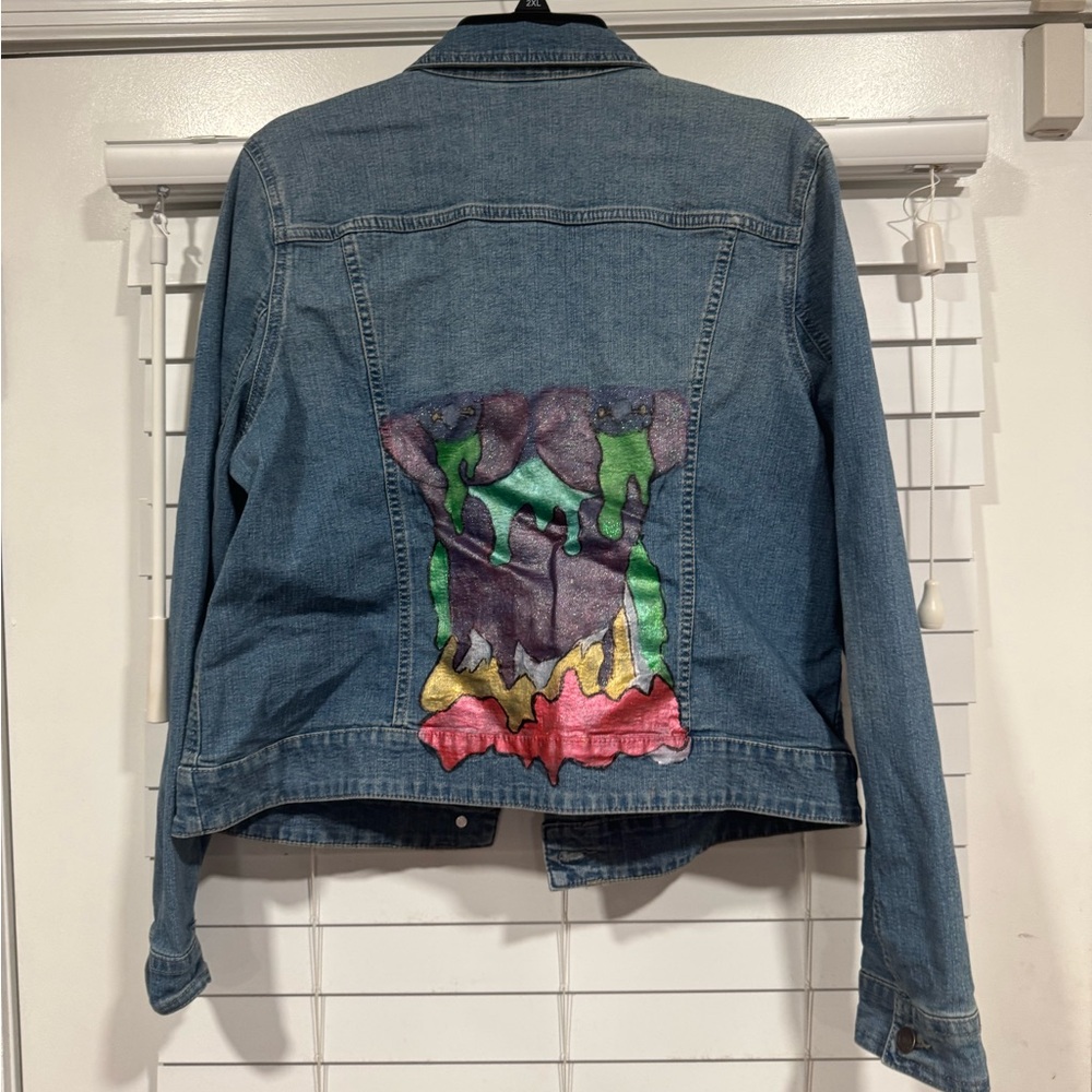Stylish denim jacket featuring a vibrant abstract design on the back. Perfect for adding a pop of color to your wardrobe.