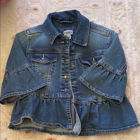 Stylish denim jacket featuring a ruffle hem and button closure. Perfect for casual wear.