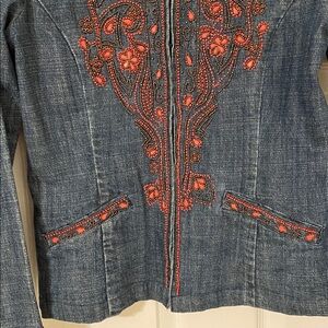 Chico’s beaded denim jacket in size 0 which is 4-6. Lightly distressed denim with rust and bronze beading. Beading seems to be securely attached. Slightly fitted. Wear open or close with the hooks. Slash pockets on front. Please ask any additional questions.