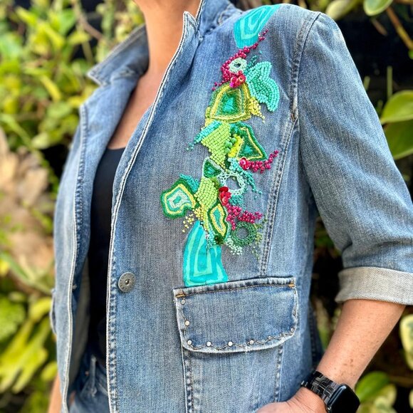 Denim Jacket with modern embrodery with beads. Unique, handmade.