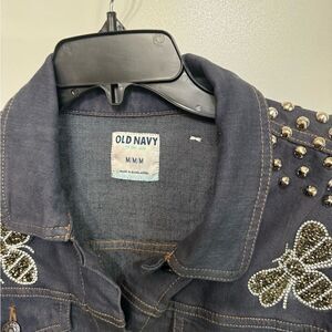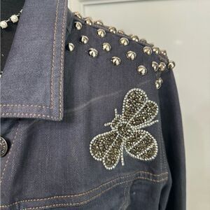 Stylish dark gray denim jacket featuring intricate embellishments on the shoulders and bumblebee designs. Perfect for adding a touch of elegance to your casual outfits.