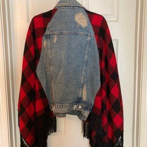 PRE-OWNED. Gently used. Denim with Black and Red fringe jacket/poncho. Women's size Medium.