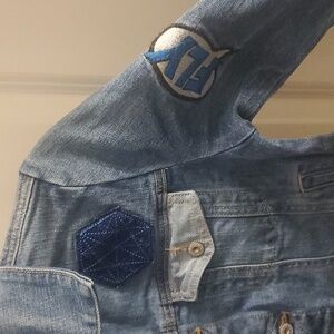 Boys denim jacket, Be A Hero embroidery. Patches and two tone color on the sleeve area.