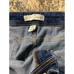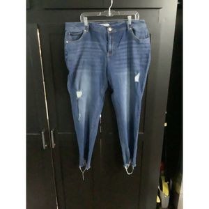 Hi rise denim jeans. Front legs have manufactured distressing. Hems are raw edge.