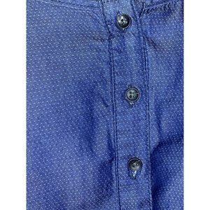 Denim look indigo blue fabric with some shine and tiny white dots. Button down to just above bottom ruffle. Tunic like style. Adjustable straps. Metal buttons.