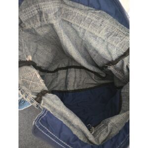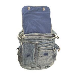 Denim style cotton blended material crossbody bag. Bag has multiple pockets inside and outside with adjustable strap and side pockets. Bag does have a small mark on the inside underneath the main flap. Tag had been removed; so source of bag is unknown. Please see all photos for details.