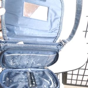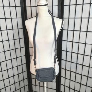 Blue Denim Purse Cross Body Bag. Adjustable strap, many pockets and compartments including card holders/built in wallet, zipper and Velcro closures. Condition is Pre-owned, Good- minor wear. Cross Stitch.