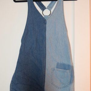 2 Toned Mini Denim Dress, with front pocket detail and hoop cross back. Looks super cute with a bralette or tshirt underneath. It is a Size 2, but I would say it fits smaller and would be more like a Size 0.