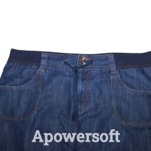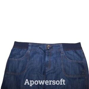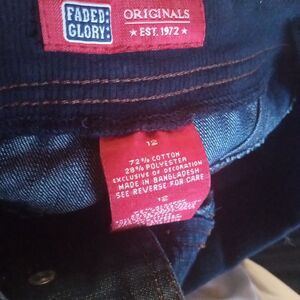 Dark wash, light denim,zip with double buttons and knit draw cord waist,two front and two rear pockets. Great condition no flaws faded glory circa 1990s size 12