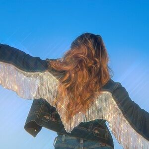 Denim Of Hollywood custom western-inspired denim jacket embellished with the highest-quality rhinestone fringe (hand-sewn) Perfect for Beyonce concert, Festivals, Nashville trips, bachelorette etc...