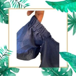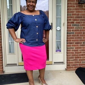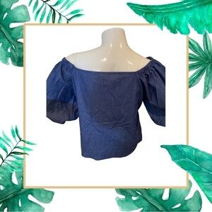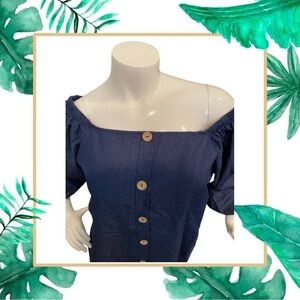 Our denim top is perfect to pair with a colorful skirt or white or blue jeans. There is elastic in the shoulders that can be pulled down for a night look or worn up for more daytime look. Theres faux button detail on the front.