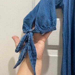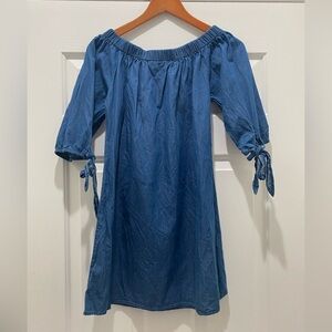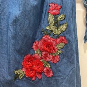 Denim Off the Shoulder Dress with Floral Embroidery Detail, M