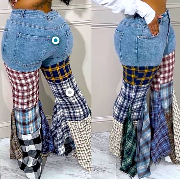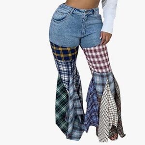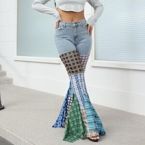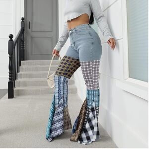 Feature: Bellbottom jeans, plaid patchwork, skinny flare jeans, asymmetrical ruffle hem denim pants, bodycon long pants, irregular plaid pattern, color block jeans for women.