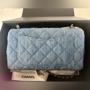 Pristine condition (9.8/10) Authentic Chanel Denim Pearl Crush Mini (rectangular) with protective stickers still attached to interior hardware. Comes with full set including receipt, care card, box. This one is microchipped so no authenticity card. Coming from a pet free smoke free home.