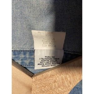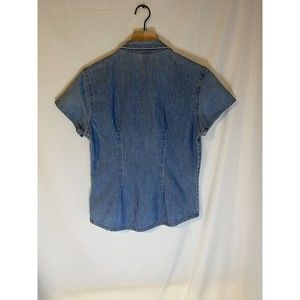 Stylish vintage denim pearl snap button down shirt with short sleeves. Perfect for casual outings. Layer over or under.