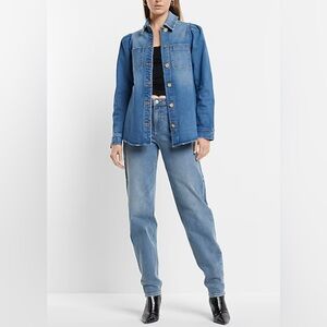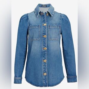 Trendy blue denim shirt jacket with puffed shoulders, button details. Has two lateral hand hidden pockets, and two front chest pockets. Perfect for casual wear. Side slits.