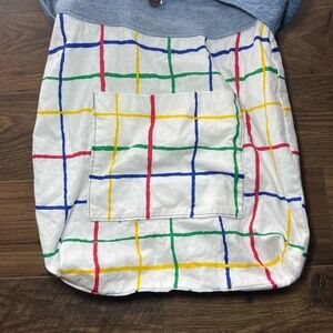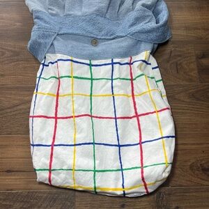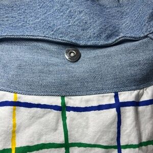 Handmade Denim Purse Tote Bag Light Blue Wash Denim Lined Inner Pocket White Inner Inner with Colorful Square Print Magnetic Snap Closure Wide Shoulder Strap Pleats Jeans Hobo Satchel