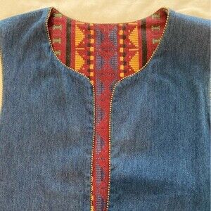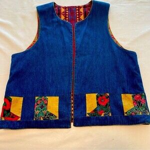 Unique and beautiful reversible open front vest. One side is blue denim with striking boot pattern inset and gold tone studs. Other side is southwestern batik pattern. Perfect for: work, date night, cocktails, outdoor garden party, BBQ event, holiday, resort wear, casual, vacation, travel, festival, concert, weekend wear, rodeo, western event, and any day you feel like looking chic!