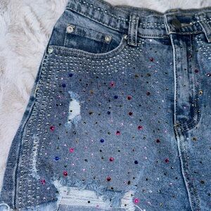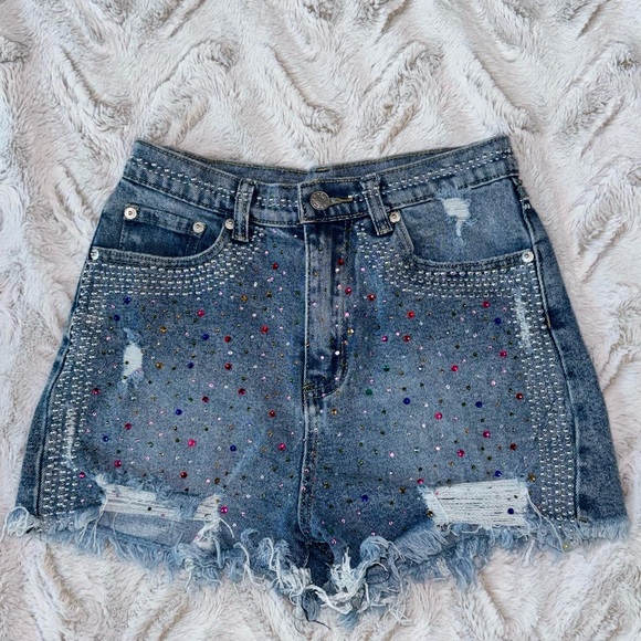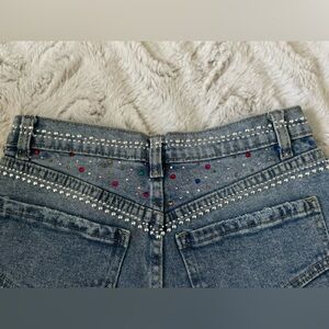 Denim Rhinestone Shorts by Blue B Collection: Size Small, worn only once, these shorts are in great condition. Coming from a non-smoking household. They feature sparkling rhinestones that add a touch of glam to any outfit. Perfect for adding a bit of sparkle to your wardrobe!