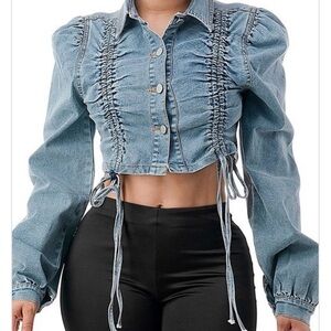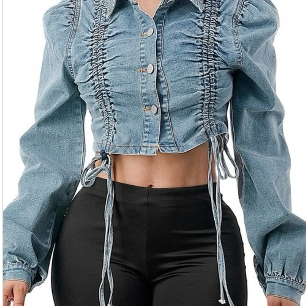 Stylish denim jacket with ruched detailing. Features button-up front and adjustable ties. Perfect for casual outings.