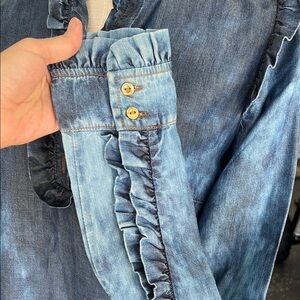 Stylish denim blouse with elegant ruffle details. Perfect for casual outings or a chic office look.